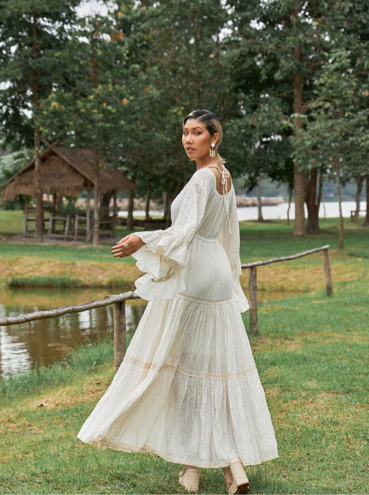 Angel Sleeves Maxi Dress Cotton-Trim-LaceUp Front