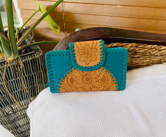 Aloha Mandala Leather Wallet Turquoise and Tan Plaid Stitching