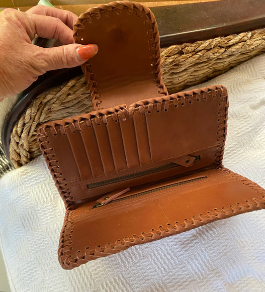 Aloha Mandala Leather Wallet Rustic Brown Plaid Stitching