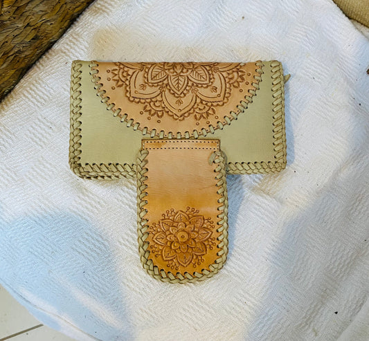 Aloha Mandala Leather Wallet Beige and Tan Plaid Stitching