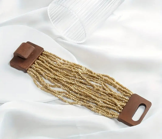 Wood Buckle Multi Strand Elastic Stretch Beaded Bracelet Gold