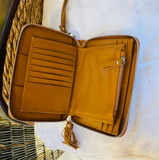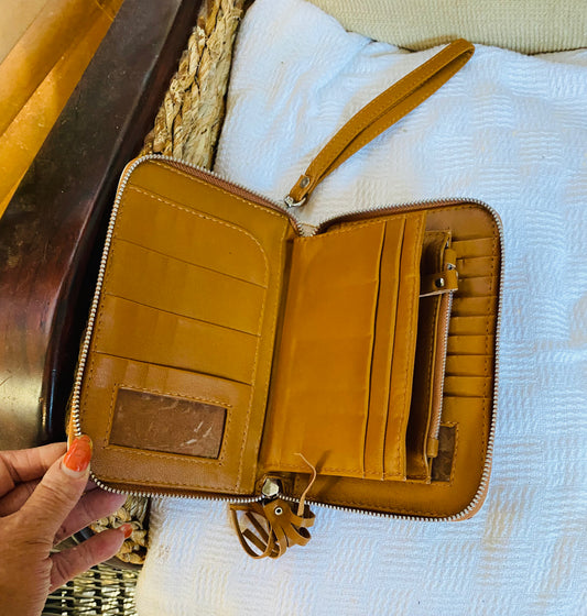 Aloha Mandala Leather Wallet Beige and Tan Plaid Stitching