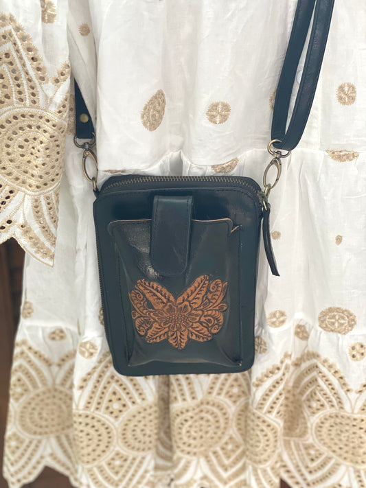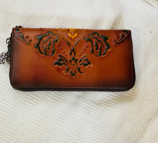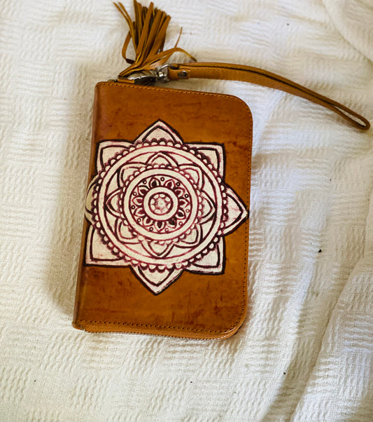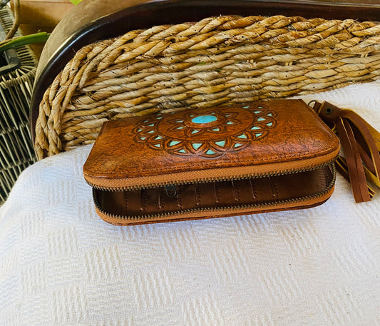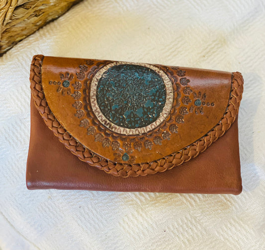 Lotus Carved Leather Wallet Turquoise Inlay and Stone