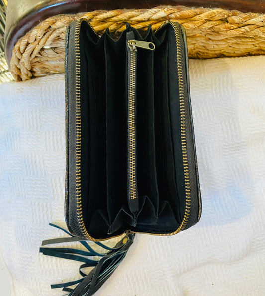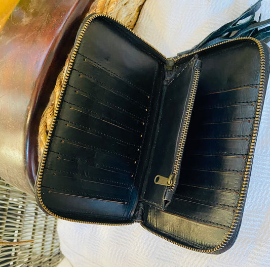 Majestic Carved Leather Wallet Black Turquoise Inlay