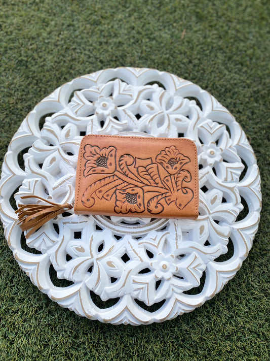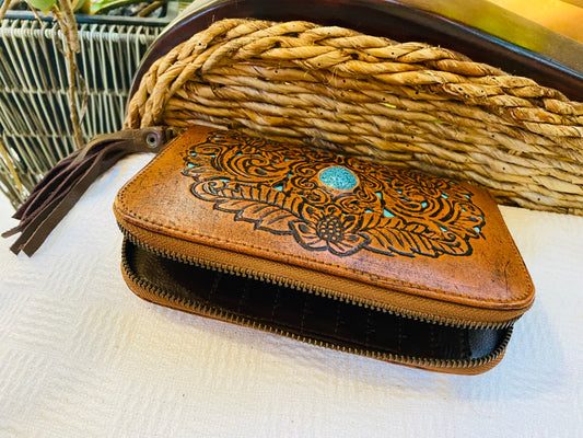 Lotus Carved Leather Wallet Turquoise Inlay and Stone