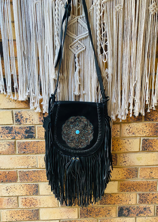 Leather Turquoise Flower Bag Fringe Tassels Black