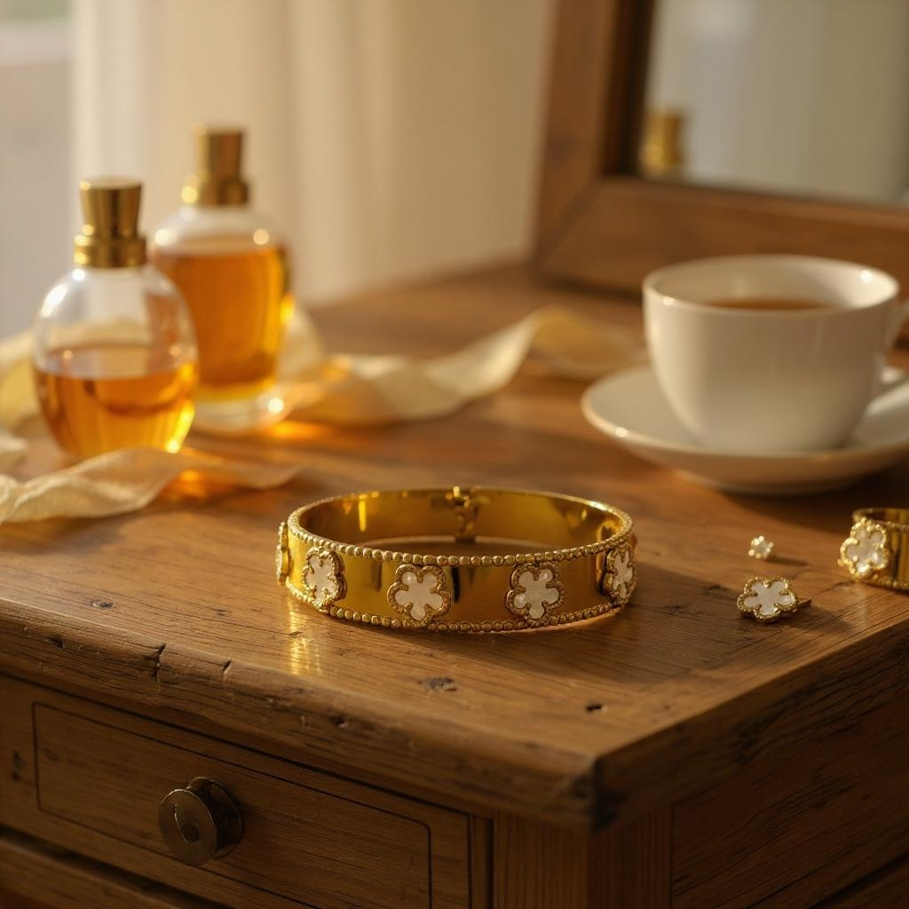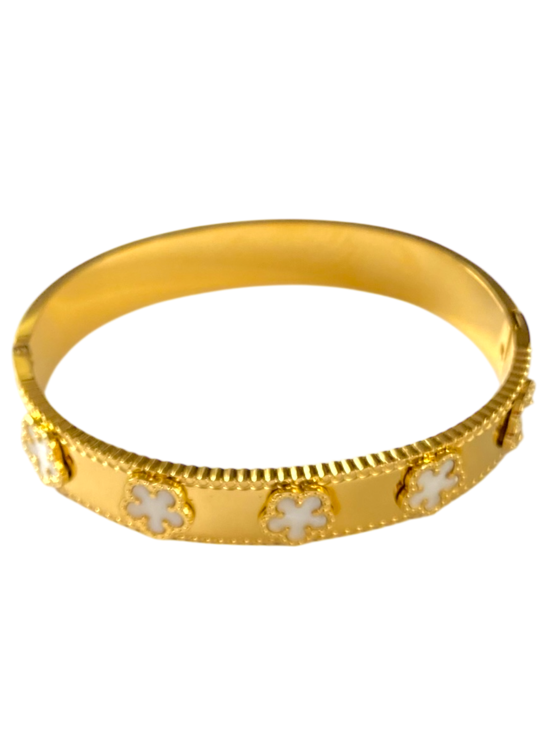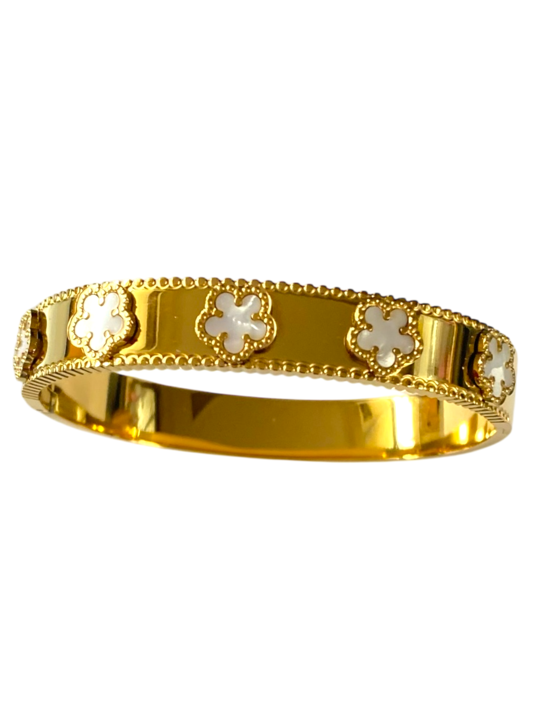 Bangle flower mother of Pearl clover bangle crafted from 18k gold plated stainless steel. Features a smooth, polished finish with a nice weight and luxurious feel. Open hinge style for easy wear — a timeless piece symbolising luck and positivity.