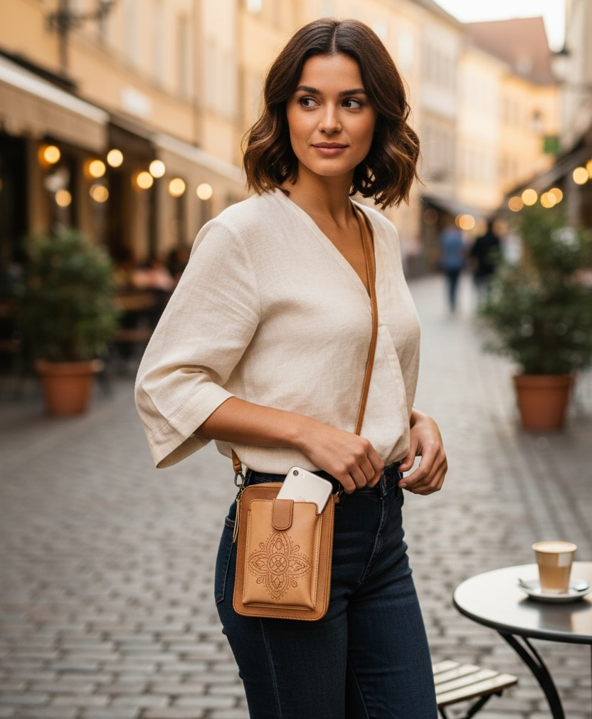 This beautifully two tone brown phone wallet bag features a hand-tooled floral and geometric motif on the front panel, adding a unique artisan touch to its classic design. Made from 100% genuine leather, it's both durable and stylish-perfect for everyday use or travel.