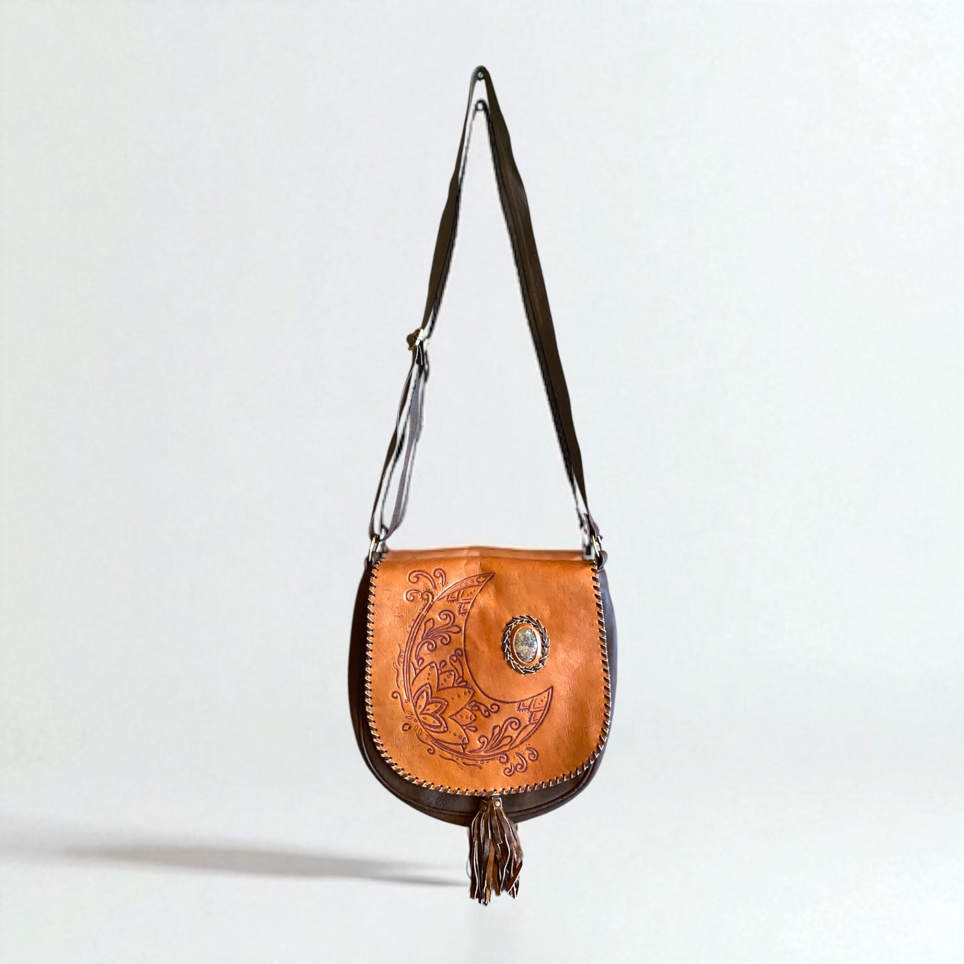 Rustic and full of character, this brown crescent moon bag is crafted from genuine leather and features a beautifully hand-tooled crescent moon design with a crescent stone inset for a mystical touch. The interior is lined with soft suede and includes practical zip and slip pockets for easy organisation. A good-sized statement piece has adjustable strap perfect for festivals, boho styling, or the free-spirited gypsy girl at heart. A unique blend of artisanal craftsmanship and earthy charm.