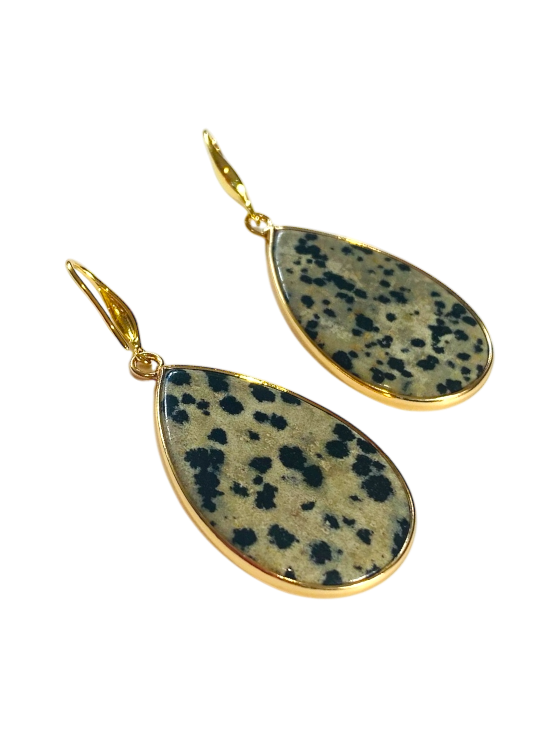 These earrings have a Dalmatian Jasper teardrop natural stone set in a 18k gold-plated frame, giving them that earthy yet refined look often found in mystic boho style.