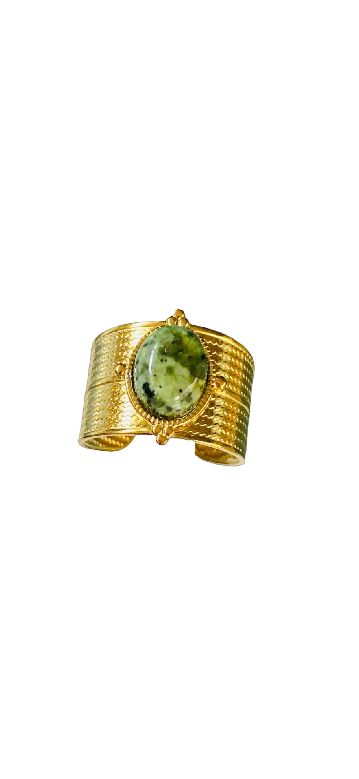 Channel grounding energy and earthy elegance with this stunning Serpentine green stone ring. Known for its protective and healing properties, the natural stone is set in a beautifully textured 18k gold plated band with an open gap design to fit most sizes. Lightweight waterproof, and hypoallergenic — it's a perfect everyday piece for the free-spirited soul. A powerful companion for inner peace, balance, and bohemian style.