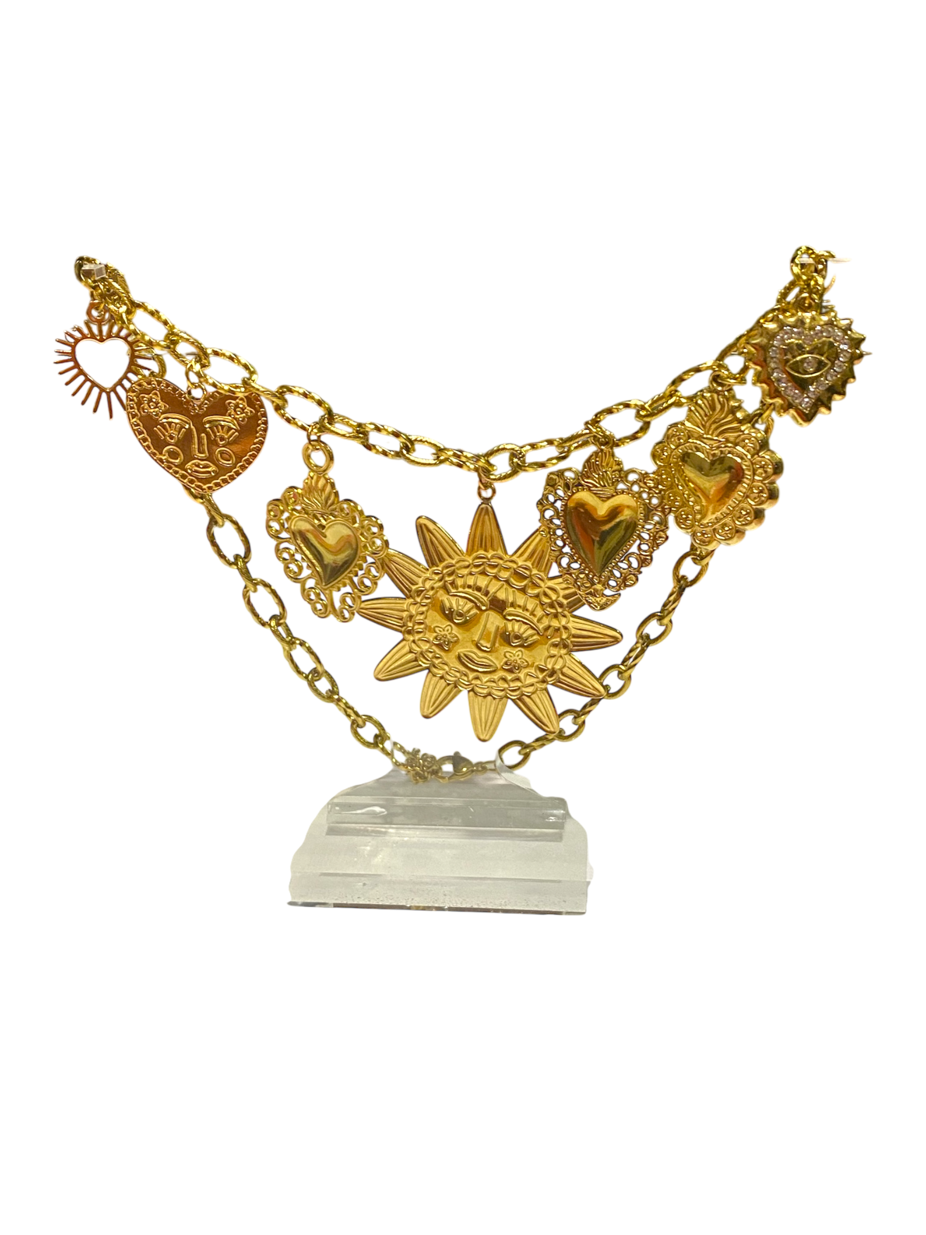 Sun Heart Pendant Necklace is a lovely statement necklace. Featuring 6 beautiful heart pendants-each pendant a good size for standout style—with a large sun pendant as the centre Peice. Crafted in 18k gold plating on a classic cable chain, this bracelet is non-tarnish, hypoallergenic, and made to last. Romantic, elegant, and full of charm, it's the perfect blend of sentiment and Mediterranean style.
